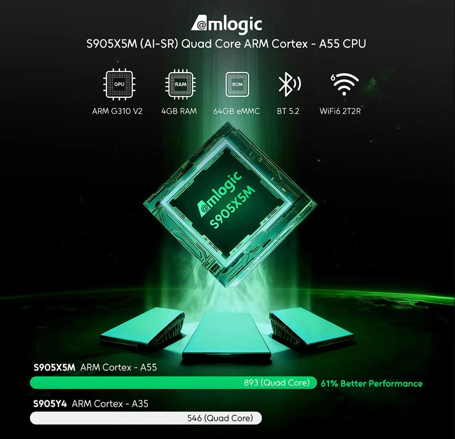 • Powerful Performance: Equipped with a quad-core Amlogic S905X5M processor, 4GB of DDR4 RAM, and 64GB of eMMC storage for fast, responsive streaming and multitasking.