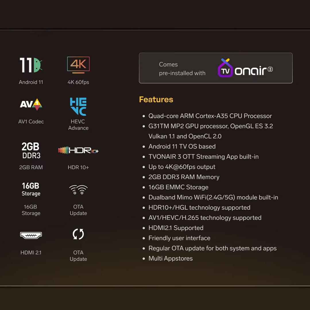 Smooth & Responsive Performance – Powered by the Amlogic S905W2 Quad-Core ARM Cortex-A35 (64-bit) processor (up to 1.8GHz), delivering smooth navigation, quick app launches, and reliable performance.